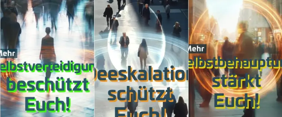 Unsere Plakat-Posts zeigen Peter & Dietmar umgeben von Schutzkreisen – als Symbol für innere Stärke und persönliche Grenzen. Die Kreise stehen für deine eigene Sicherheit, die du durch unsere Trainings aufbaust.